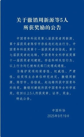 9月19日,中国科协发布公告,因周新源等5人存在违纪违法行为或科研失信行为,奖项主办单位决定撤销其所获中国青年科技奖等奖励,并收回奖章、证书、奖金。
